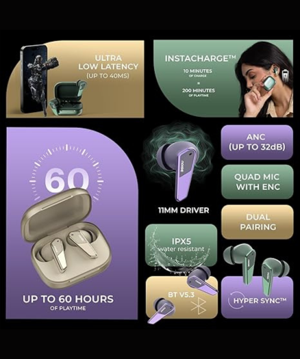 - ANC (up to 32 dB) - Listen to your playlists just the way you like it—without any background disturbances.