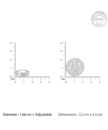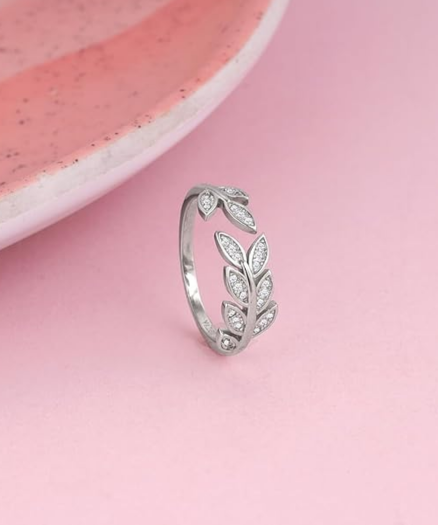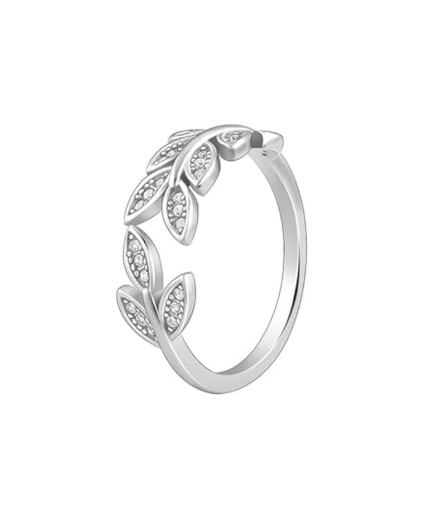 - This silver ring has an open design, with two leaf branches sporting zircons on both ends.