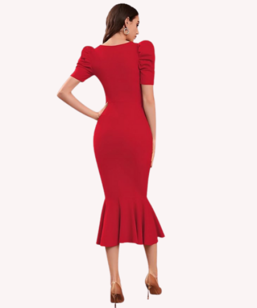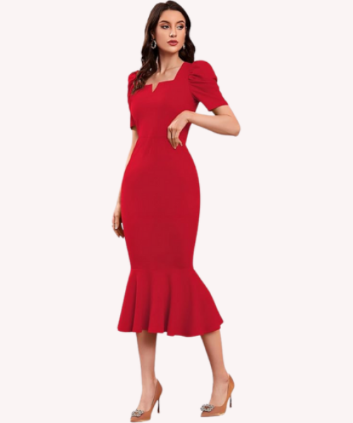 - ✅ PATTERN: Solid/Plain | Closure: Pull On | Type: Bodycon One Piece | Neckline: Notch Neck | Sleeve Type: Puff Sleeve | Sleeve length: Half Sleeve | Waist line: High Waist | Hem Shaped: Round long.