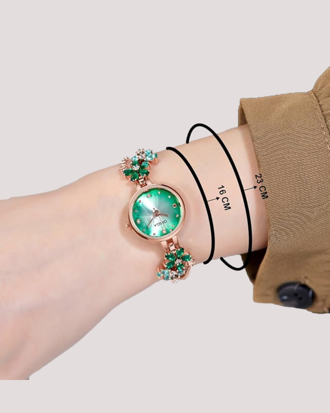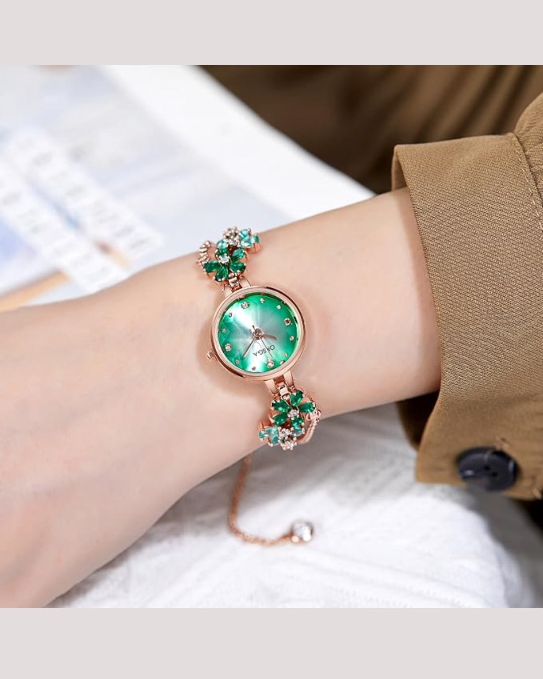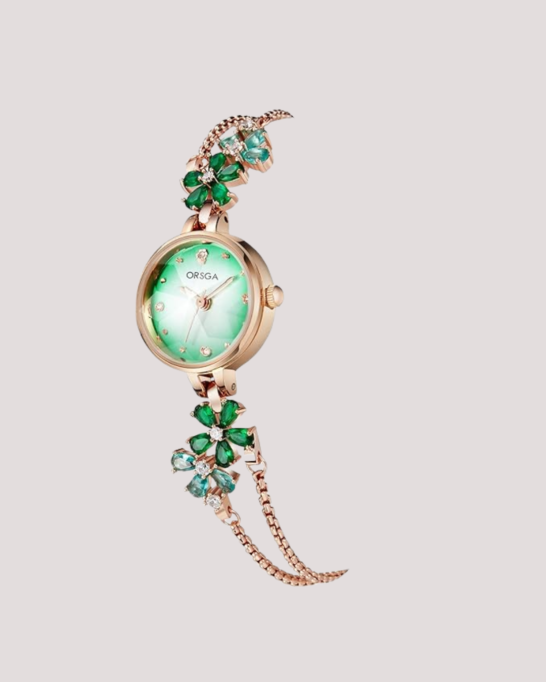 - ORSGA Fleur Designer Watch: A masterpiece that redefines designer watches for women. it's a statement piece, blending the timeless allure of latest diamond watches with the functionality of a watch for women with a bracelet. The beautifully crafted green flower chain bracelet women's watch.